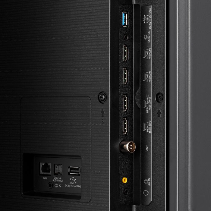 المدخلات: 4 منافذ HDMI (بما في ذلك 1 eARC)، ومنفذان USB، ومنفذ إيثرنت، وواي فاي، وبلوتوث