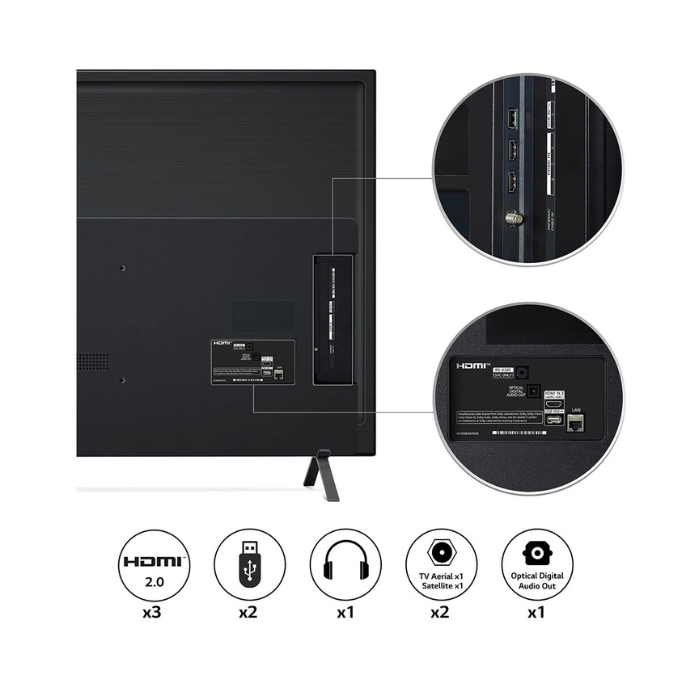 المداخل: HDMI - 1 (خلفي) - 2 (جانبي) (الإصدار 2.0) - Simplink (HDMI CEC) - نعم - eARC / ARC (قناة إرجاع الصوت) - eARC (HDMI 3) - USB - 1 (خلفي) / 1 (جانبي) - LAN - نعم (خلفي) - فتحة CI - نعم (جانبي) - مدخل RF - 2 (جانبي - RF / Sat) - SPDIF (مخرج صوت رقمي بصري) - نعم (خلفي)